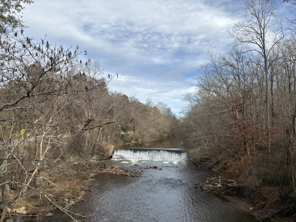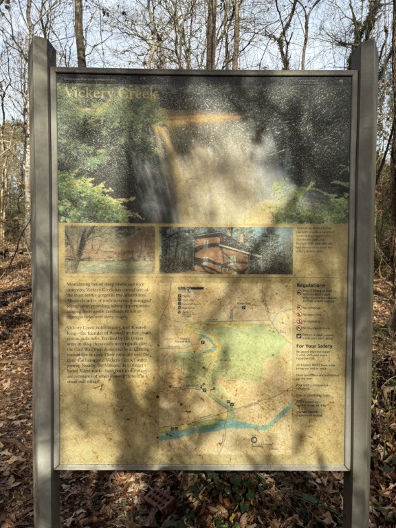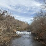 The Oxbo Trail runs between Waller and Grimes Bridge Parks with an extension that follows Waller Creek for about a mile. It has a mix of dirt, paved, and crushed stone trails and can be accessed from either park or from a parking area along Grimes Bridge Road. A bridge separates the Oxbo Trail from the Vickery Creek Trail system (which is managed by the National Park Service), so a longer hiking option is available if you join the two trail systems. This hike starts at the Oxbo Road trailhead, follows the the creek upstream to the waterfall, crosses the bridge, then loops back from the ridgeline over the river. The highlight of this route is the waterfall along Oxbo Road. It’s impressive from the bridge – especially after a heavy rain – but the waterfall over the dam is easiest to see in the winter months.