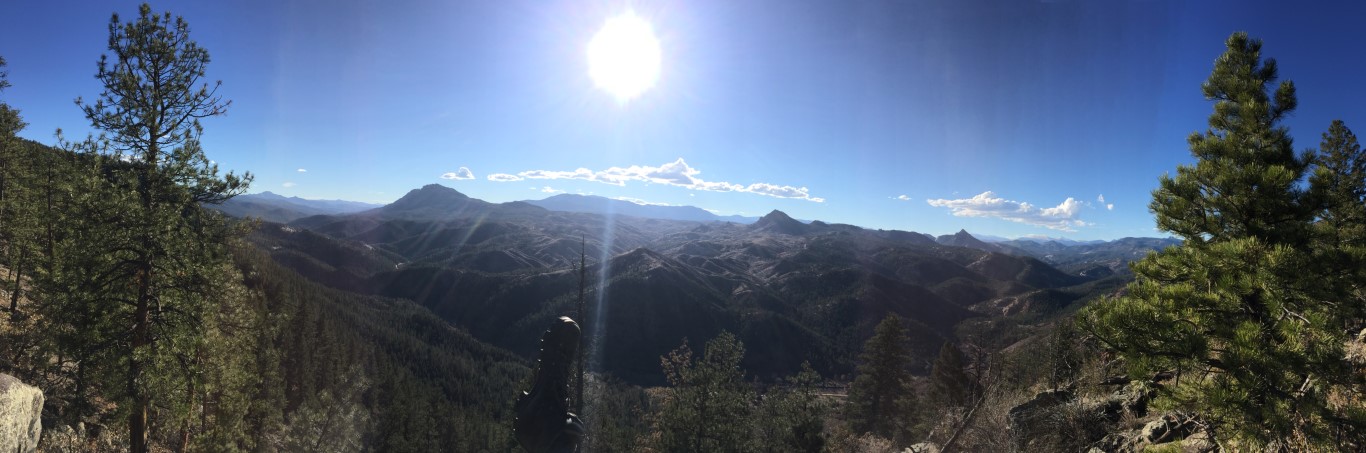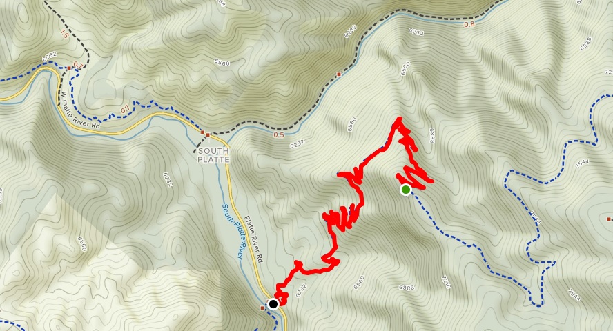 The South Platte River is a major tributary of the Platte River, flowing for 439 miles through Colorado and Nebraska. The South Platte begins as three forks in the South Park grassland basin of Colorado. After being joined by its forks, the river flows through the heart of Denver, where it once served as a “backdoor” for industry. The South Platte continues east from Denver for about 200 miles before meeting the North Platte River near the city of North Platte, Nebraska, to form the Platte River. This is a short backtrack hike on a portion of the Colorado Trail that climbs 5.2 from the South Platte River (~6000′) to a ridge line and rock outcrop (~7300′). There are excellent views from the ridge to the West and to the river and valley floor below.