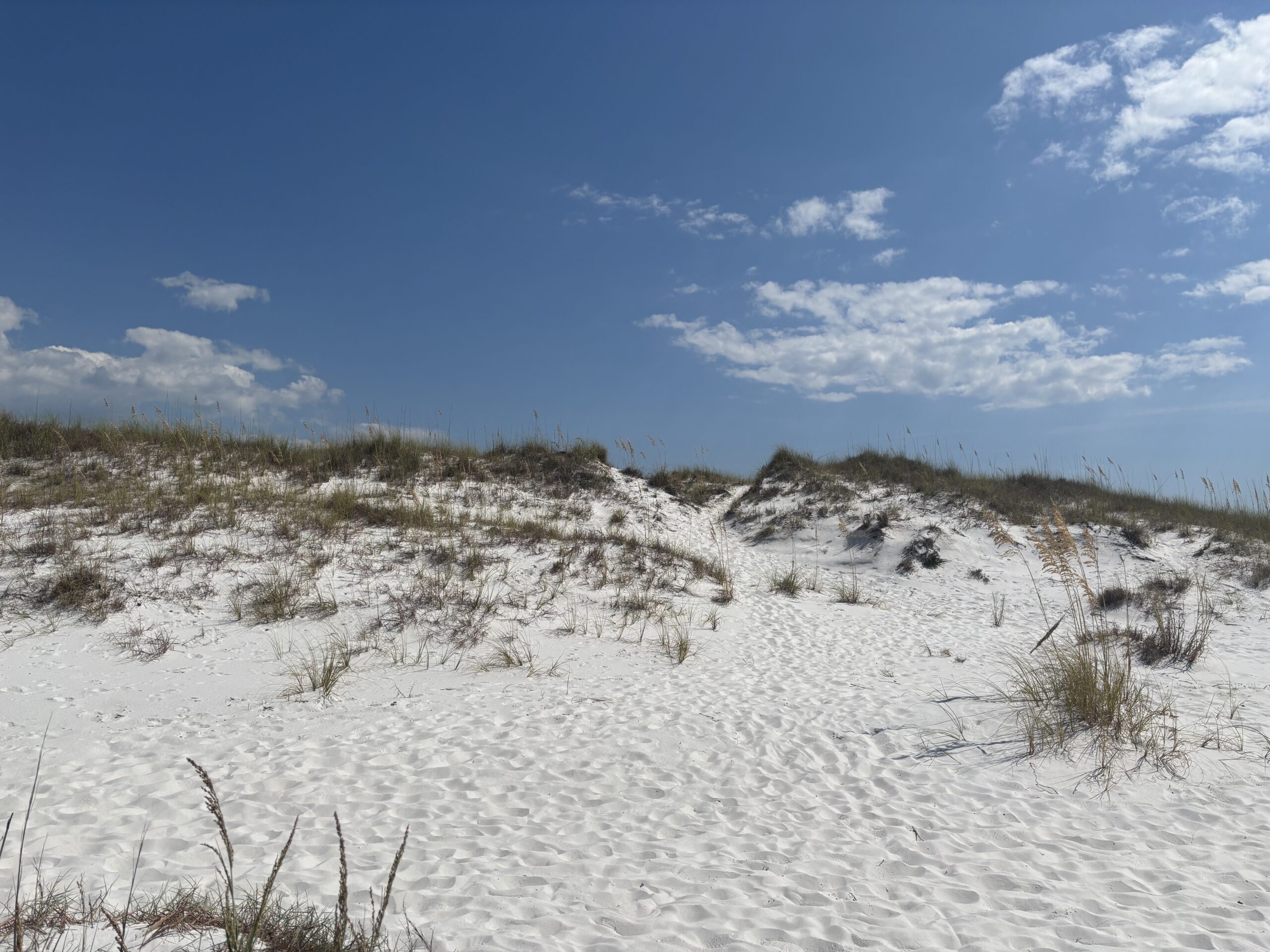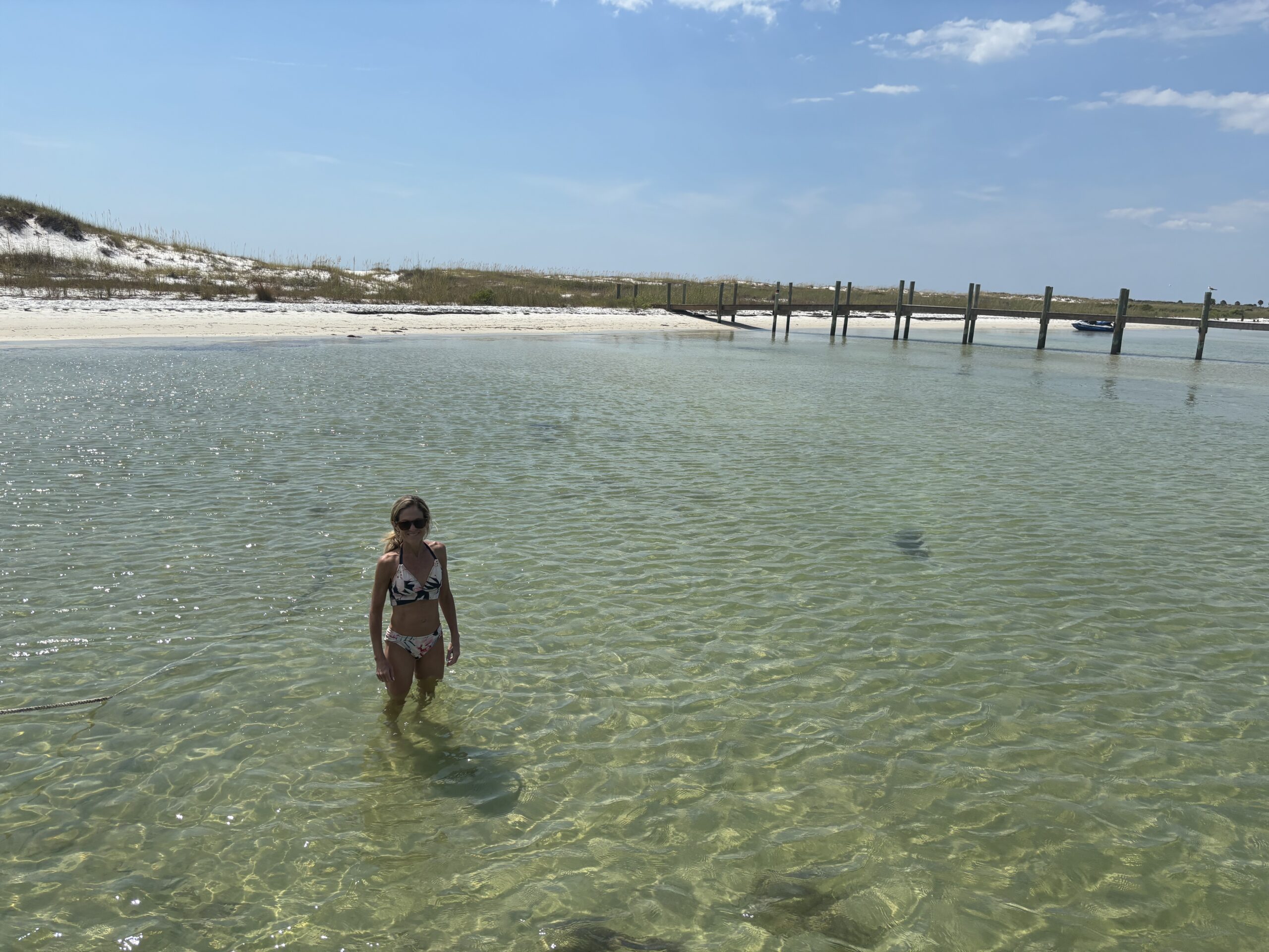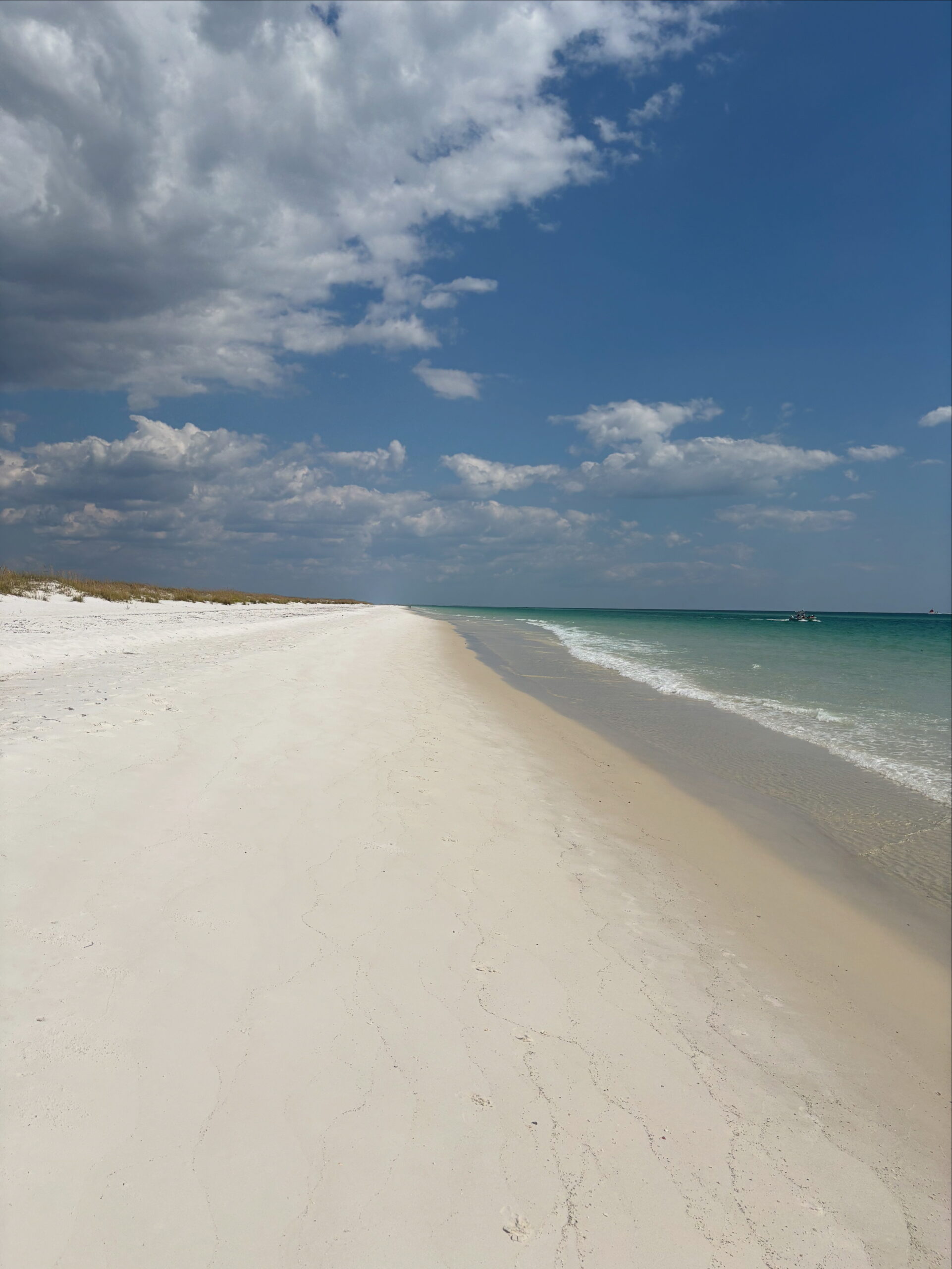 Hiking on Shell Island is mostly “off‐trail” or along the beach. There is both a Gulf and beach side of the island which offer different experiences. The bay and Gulf side is calmer with grass flats and shallow bays where boats can anchor and visitors can wade in shallow water to shore. The ocean side has more wind but offers a pristine white sand beach to explore. On our hike we walked from the gulf side to the ocean side and explored the beach for a few hours – but you can essentially create your own route here. If you prefer more traditional trails, St. Andrews State Park has two blazed trails a short distance (or boat ride) from Shell Island.