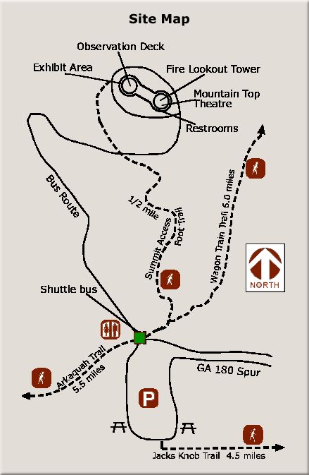 There are a few longer 4-5 mile trails in the park including the Jacks Knob Trail and Arkaquah Trail. There is also a 0.6 mi paved trail that climbs steeply with a ~12% grade from the parking lot to the viewing platform. This was the path we choose for our hike to Brasstown Bald and it is a short one to the summit which begins at the parking lot. It is suitable for all ages and least to the Visitor Information Center where there are outstanding views in all directions. This facility is operated by the National Forest service since Brasstown Bald is not a State Park. Access is by Georgia State Route 180 and Spur 180, which sometimes closes in winter due to steep and winding terrain.
