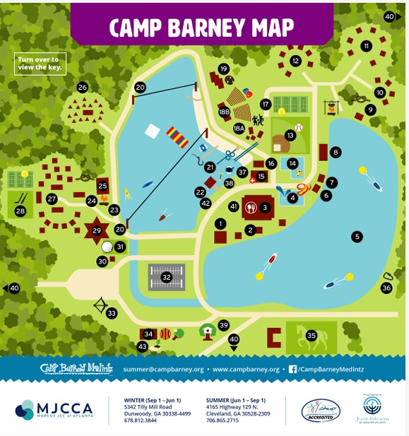 Camp Barney Medintz is the overnight camp of the Marcus JCC of Atlanta, located in the north Georgia Blue Ridge mountains and near Cleveland, GA. The camp sits on 540 acres, and has two large private lakes. Since 1963, “Camp Barney” has served nearly 1400 boys & girls each summer from all across the US. The camp is open to to kids who have completed kindergarten through 10th grade and it offers one-week, two-week, and four-week sessions during the summer. Activities include swimming, boating, water slides, horseback riding, ropes courses, zip lines, arts and crafts, performing arts, sports, high-adventure outings, and more. The camp is ACA-accredited and prioritizes safety and inclusion.
