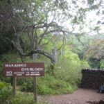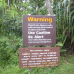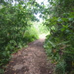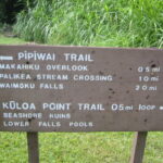 The Pipiwai Trail is a moderately strenuous 4 mile (6.3km) round trip trail. It winds upslope along the edge of Pipiwai Stream past several waterfalls and pools. The remains of a sugar mill dam, irrigation systems, and flumes of the late 1800’s can be seen in several places along the trail. The Makahiku Overlook is just .5 mile (.8km) up the trail and looks down on a beautiful 184-foot (56m) waterfall. Continue your hike over foot bridges above the stream and through the alien bamboo forest. The trail ends near the base of the 400-foot (122m) Waimoku Falls. Be prepared for rain, mud, and slippery mosses. Mosquitoes are very friendly here!