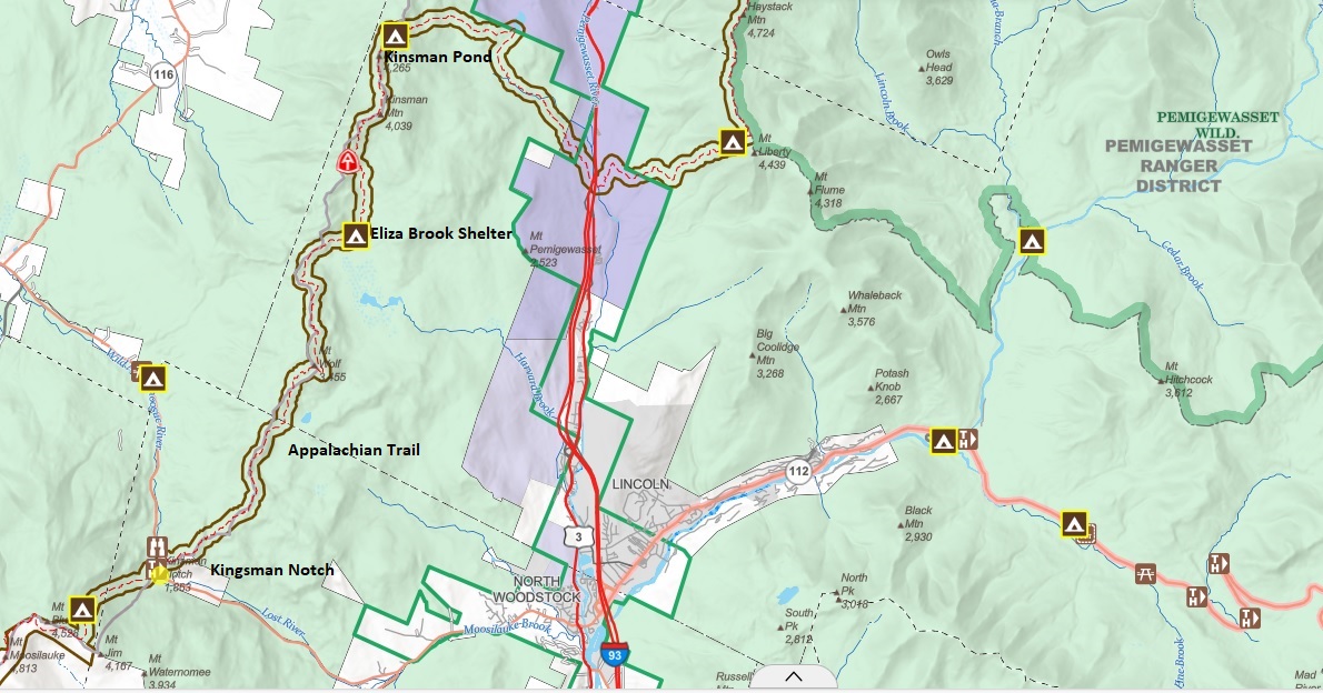 - click for a trail map from Kinsman Notch to Lafayette Campground