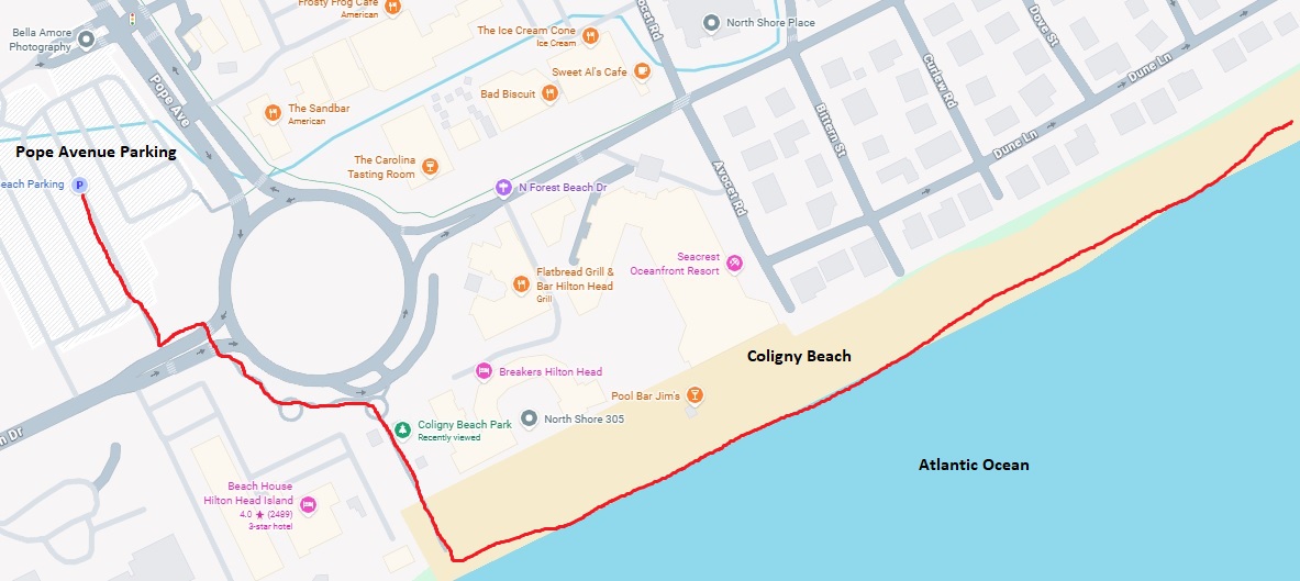 Coligny Beach is located at 1 North Forest Beach Drive on Hilton Head Island and is accessed via Pope Avenue off the Coligny Circle area.  It is a public beach and park with a free public parking area for visitors.  The beach and nearby Coligny Plaza have lots of amenities including dining & shopping — which makes it a comfortable, full-day beach option over a more remote wilderness experience like you would find at Pickney Island. Because it’s a popular public beach on the island, Coligny Beach is typically busier than many beaches on the island – especially in the summer months.  This is a short hike that starts at the Pope Avenue parking area and follows the beach northbound with views to the east of the Atlantic Ocean.  You backtrack to the parking area and the Coligny Beach Park that leads to the parking area on Pope Avenue.
