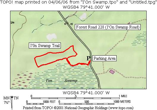 - click for a topographical map of this hike to the I’on Swamp