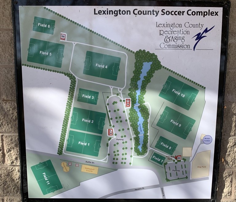 The Gibson Road Complex is a facility located in Lexington, SC with facilities for soccer, volleyball, baseball, tennis, and basketball. There are a series of long and paved walking paths at the complex which also has a large picnic shelter and restrooms on the site. The Lexington County Recreation Commission manages the Gibson Road sports facility – which is also known as the “Lexington Soccer Complex”.  On this hike, I followed a series of flat, paved trails through the complex and walked around the perimeter of the fields. The hiking is easy and is a great way to get some exercise in between sports games.