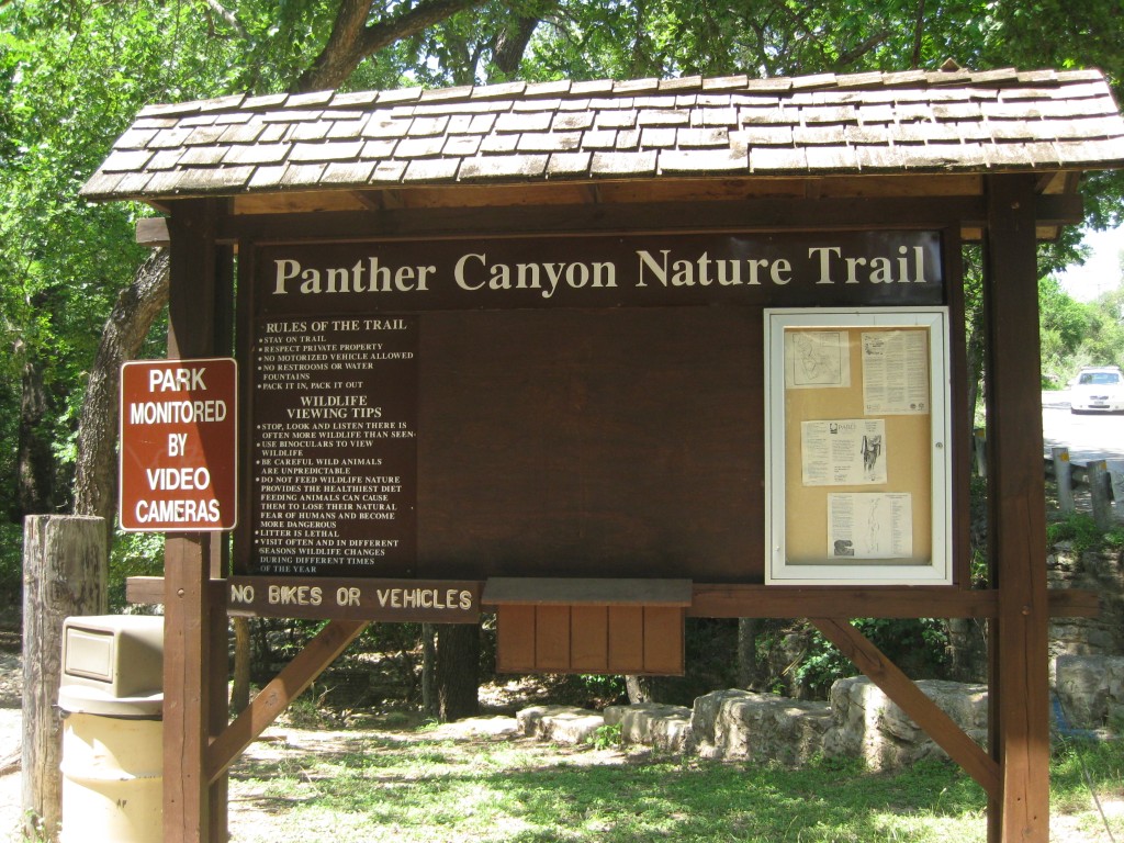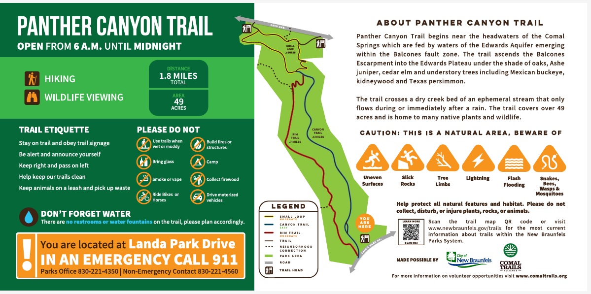 The Panther Canyon Nature Trail is located in New Braunfels and it offers a scenic and accessible hiking experience within the city’s Landa Park. The 1.8 mile trail meanders through some of the 49 acres of diverse terrain in the park – featuring native plants and animals, shaded woodlands, and a dry creek bed that flows during or after rainfall. The trail begins near the Comal Springs which is the largest natural springs in Texas and it is fed by the Edwards Aquifer. On this hike, we followed the dry Panther Creek bed up the canyon from Comal Springs and did a loop hike around the drainage bed for nearly two miles. Once you leave the Comal Spring, the trail is fairly dry in warmer months – so take plenty of water with you on the trail.