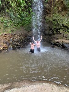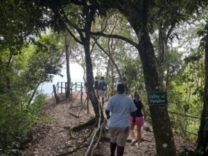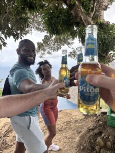 And there is a surprise that I didn’t see coming. As I finished the final climb of the “Stairway to Heaven” a small building came into view which I soon found out sold ice cold beers and local souvenirs. So we had to partake! Here we are toasting a Piton – a local beer that you can find everywhere on the island.