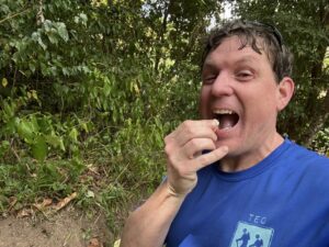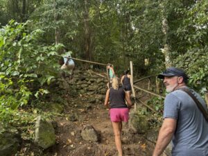 Local guides are available at the trailhead but are not required for the Tet Paul hike. It is a 1.2 mile roundtrip hike that runs a lollipop route with 111 feet of elevation gain. So it is relative easy compared to the much more challenging Piton hikes – yet there are views of both of them of this route. Here we are getting photobombed by our trail guide on the climb up the mountain.